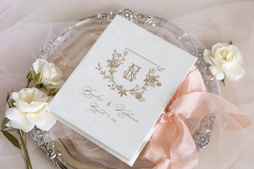 Each suite begins with a design. The crest on the top cover sets the tone for every element that follows. Ornaments, typography, and enclosure cards are all designed to match cohesively. During the design stage, a full digital proof is created to refine every detail before production.